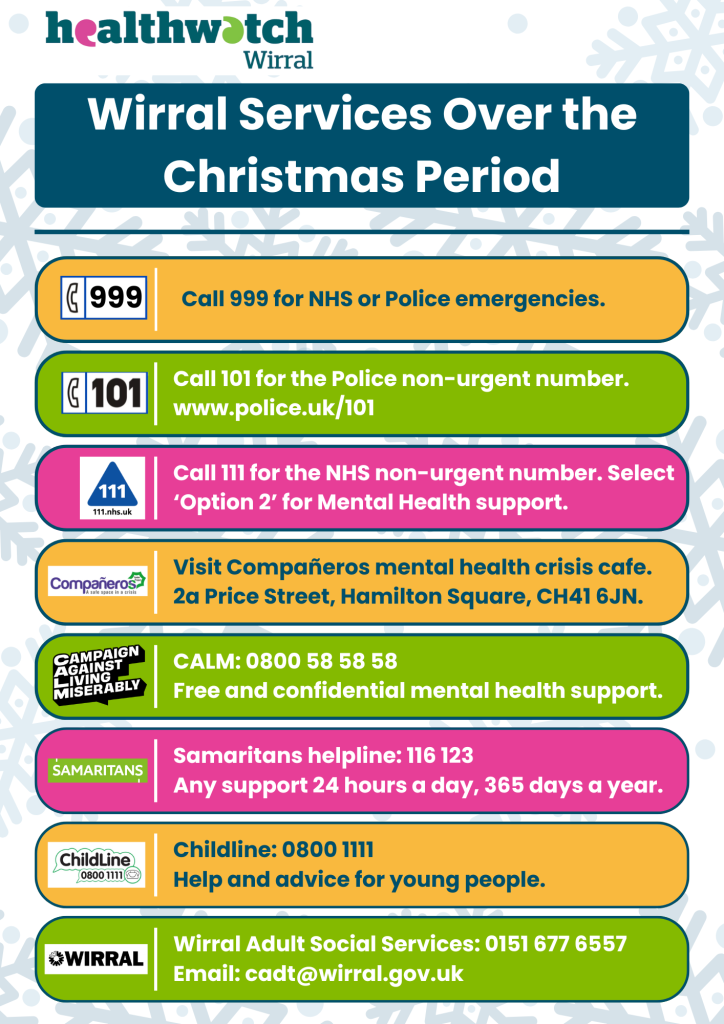 Healthwatch Wirral will be closed from 12:00PM, 24th December – 9:00AM, 5th January 2026.